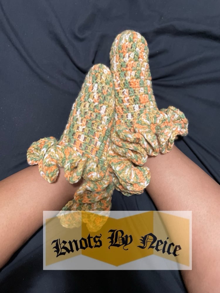 Crochet ruffle socks made to fit your feet, made with 100% acrylic yarn.